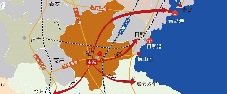 城市交通主干道貫通市域南北,棗臨嵐高速、沂冊路、南環路橫穿東西,京滬高速、206國道、通達南路、沂蒙南路縱貫南北,形成“三橫四縱”的交通路網。通達路—蒙山大道是貫穿臨沂南北的主干道,南連棗臨嵐高速,北至蒙山。在中心城區內跨越北城區、蘭山區和羅莊區,并經過臨沂站和高鐵站,距臨沂站15KM,距高鐵站30KM,距離飛機場22KM,1小時內均可到達。距連云港、嵐山港、日照港、石臼港、青島港五大港口50—100公里,交通十分便利。
