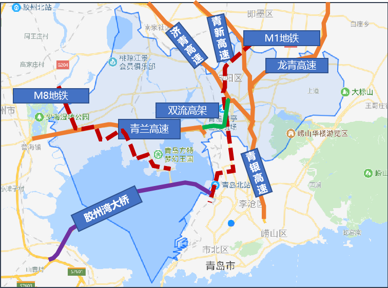 區域內有地鐵、高速公路、高架、立交橋等形成極其便利的立體交通網絡,是青島通向國內外的重要樞紐。