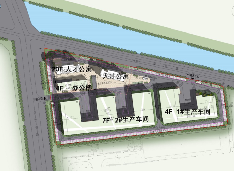 分為生產作業區和生活管理區,辦公樓設在廠房與人才公寓之間,既方便與生產作業區、生活區的聯系,又有相對安靜的環境,可以形成動、靜的兩個功能分區。