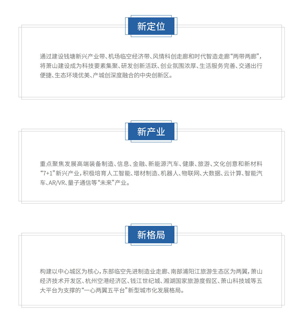 為進一步拓展新興產業發展空間,蕭山區構建包括“四大產業新城、兩大產業基地、八個特色小鎮、六個產業社區”為重點的“4286在內的產業載體。