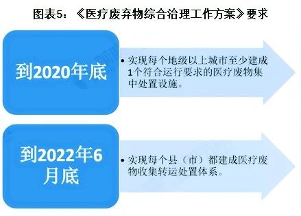 2020年2月24日,國家衛健委、生態環境部等十部委聯合印發《醫療廢棄物綜合治理工作方案》,《方案》要求,要在2020年年底前實現每個地級以上城市至少建成1個符合運行要求的醫療廢物集中處置設施;到2022年6月底前,實現每個縣(市)都建成醫療廢物收集轉運處置體系。