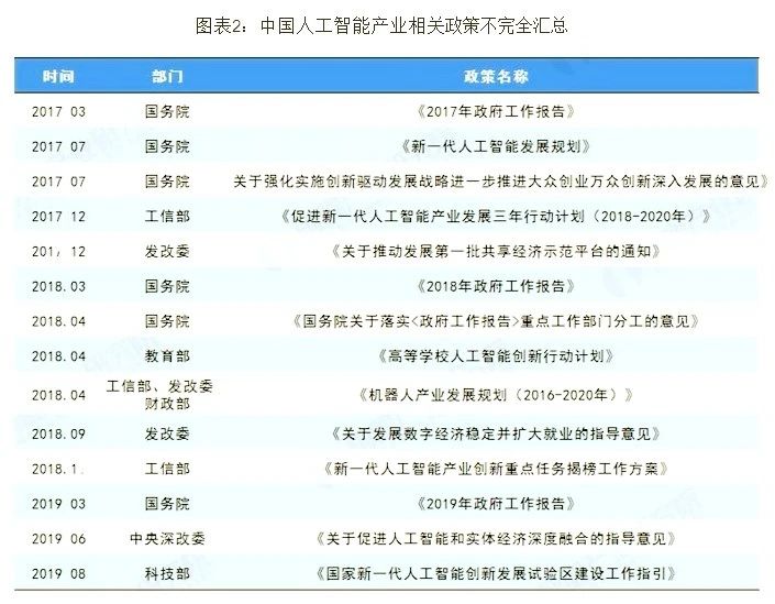 2017年,人工智能被首次寫入到政府工作報告中,2018年政府工作報告中提出:“發(fā)展壯大新動能,做大做強新興產(chǎn)業(yè)集群,實施大數(shù)據(jù)發(fā)展行動,加強新一代人工智能研發(fā)應(yīng)用,在醫(yī)療、養(yǎng)老、教育、文化、體育等多領(lǐng)域推進‘互聯(lián)網(wǎng)+’。發(fā)展智能產(chǎn)業(yè),拓展智能生活。”,2019年的政府工作報告中,對人工智能的描述也由“加快人工智能等技術(shù)研發(fā)和轉(zhuǎn)化”、“加強新一代人工智能研發(fā)應(yīng)用”變?yōu)?ldquo;深化大數(shù)據(jù)、人工智能等研發(fā)應(yīng)用”,可見在國家層面上,對人工智能產(chǎn)業(yè)的重視程度日益加深。