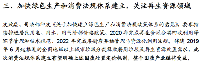 加快綠色生產和消費法規體系建立,有利于順價機制建立。發改委、司法部印發《關于加快建立綠色生產和消費法規政策體系的意見》,要求持續推進居民用電、用水、用氣階梯價格政策、2020年完成再生資源分類回收利用等環節管理和技術規范、2022年完成餐廚廢棄物管理與資源化利用法規。伴隨2019年6月起推進的全國地級以上城市垃圾分類釋放餐廚垃圾及再生資源處置需求,此次消費法規體系建立有望明確上述固廢處置定價機制,整個固廢產業鏈將受益。