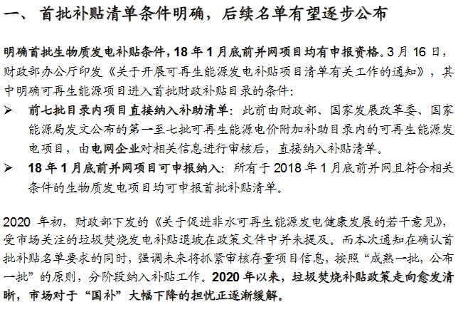 可再生能源首批補貼名單條件明確,期待后續清單審批加速落地。3月16日財政部印發《關于開展可再生能源發電補貼項目清單有關工作的通知》,明確前七批目錄內以及符合要求的2018年1月底前并網的生物質發電項目可納入首批財政補貼清單,并強調未來將按照“成熟一批,公布一批”的原則,分階段納入補貼工作。2020年以來,垃圾焚燒補貼政策走向愈發清晰,市場對于國補大幅下降的擔憂正逐漸緩解。