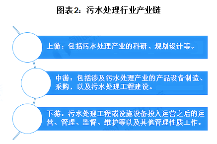 我國用水總量較大的局面促進了水務行業中污水處理行業的不斷發展。污水處理產業鏈上游包括污水處理產業的科研、規劃設計等;中游包括污水處理產業的產品設備制造、采購,以及污水處理工程建設;下游是指污水處理工程或設施設備投入運營之后的運營、管理、監督、維護等以及其他管理性質工作,屬于服務業的范疇。