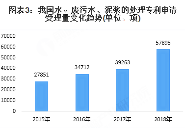 污水處理技術是推動污水處理行業高效發展的關鍵因素。數據顯示,2015年以來,我國水、廢污水、泥漿的處理專利申請受理量逐年提升,特別是2018年,相關專利受理量達5.79萬項,同比增加47.45%,可見我國的污水處理技術正逐步提升。