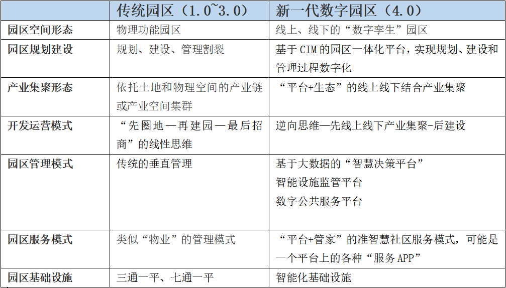 新一代數(shù)字園區(qū)不僅是“傳統(tǒng)物理園區(qū)+數(shù)字化”, 而是依托5G、人工智能、大數(shù)據(jù)、BIM/CIM、工業(yè)/產(chǎn)業(yè)互聯(lián)網(wǎng)平臺等“數(shù)字基建”,催生的園區(qū)產(chǎn)業(yè)集聚形態(tài)、開發(fā)運營模式、園區(qū)發(fā)展形態(tài)、管理模式、服務(wù)模式及基礎(chǔ)設(shè)施的多層次變革,主要包括以下幾個方面: