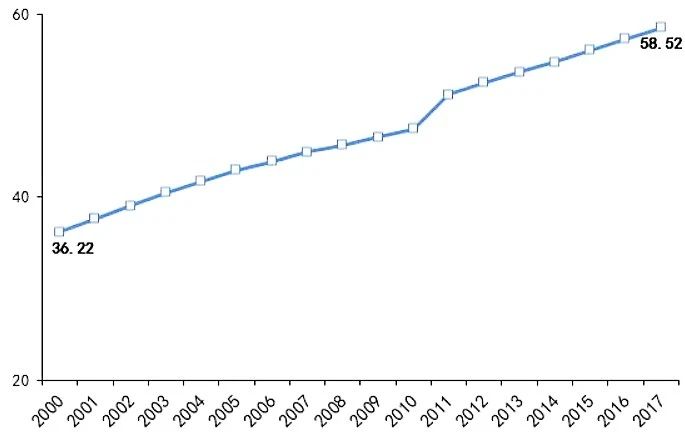 圖表:2000-2017年中國人口城鎮化率(單位:%)