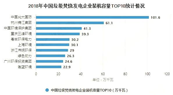 中國產(chǎn)業(yè)發(fā)展促進會生物質(zhì)能產(chǎn)業(yè)分會于2019年6月27日發(fā)布的《2019中國生物質(zhì)發(fā)電產(chǎn)業(yè)排名報告》顯示,2018年我國垃圾焚燒發(fā)電前十的企業(yè)分別為光大國際、錦江集團、中國環(huán)境保護集團、重慶三峰環(huán)境、粵豐環(huán)保電力、上海環(huán)境、偉明環(huán)保、綠色動力、廣州環(huán)保投資集團、瀚藍環(huán)境。從裝機容量、垃圾處理量、發(fā)電量以及年上網(wǎng)電量來看,光大國際垃圾發(fā)電均遙遙領先,斷層優(yōu)勢明顯。