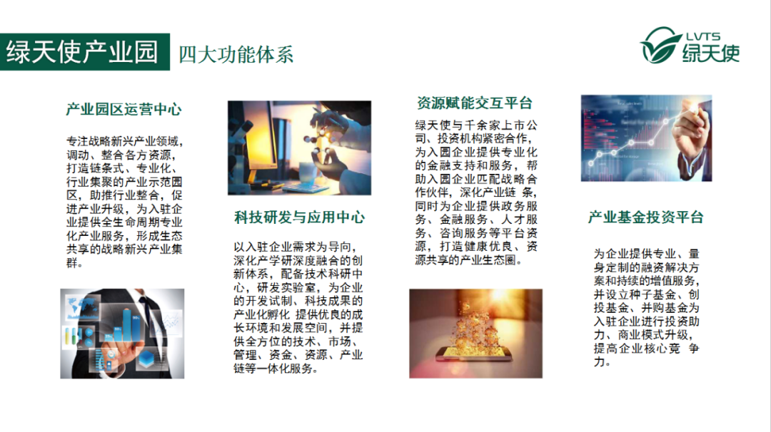 綠天使集團是中國領先的專注于服務戰(zhàn)略新興領域,為快速成長的科技企業(yè)提供專業(yè)化產(chǎn)業(yè)升級服務的機構。以孵化基地為支點,調(diào)動、整合各方資源,為創(chuàng)業(yè)者打造一個環(huán)境優(yōu)良的創(chuàng)業(yè)生態(tài)圈。綠天使集團目前推介已運營14個創(chuàng)業(yè)園區(qū)和15個產(chǎn)業(yè)園區(qū),成立3支產(chǎn)業(yè)專項投資基金,孵化企業(yè)1000余家,已投資企業(yè)近60余家。通過在相關領域不斷深耕,綠天使集團逐步形成以孵化+投資+加速+輔導上市的特色運營模式,打造鏈條式、專業(yè)化、行業(yè)集聚的產(chǎn)業(yè)示范園區(qū)。促進產(chǎn)業(yè)新模式、新業(yè)態(tài)、新技術的升級,推動戰(zhàn)略新興產(chǎn)業(yè)的快速發(fā)展,提升相關行業(yè)的產(chǎn)業(yè)化、科技化、國際化,助力行業(yè)整合,促進產(chǎn)業(yè)升級,打造鏈條式、專業(yè)化、行業(yè)集聚的產(chǎn)業(yè)示范園區(qū),形成生態(tài)共享的產(chǎn)業(yè)集群。