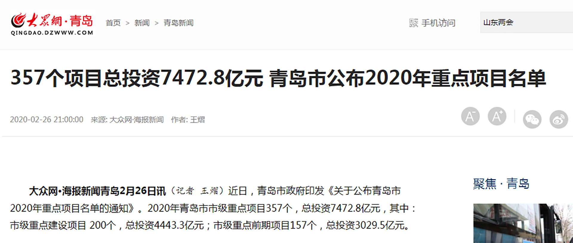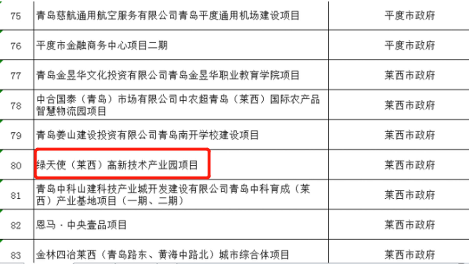青島市政府近日印發《關于公布青島市2020年重點項目名單的通知》。2020年青島市級重點項目總投資7472.8億元。綠天使(萊西)高新技術產業園項目位列其中。