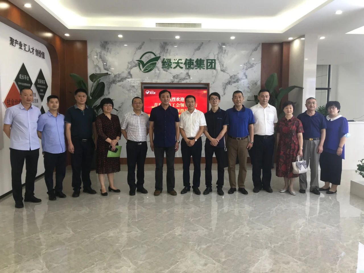 近日,青島市總工會副主席周新國、市總工會副巡視員阮丁、城陽區總工會黨組書記、主席孫立新、工友創業聯盟理事長王濤宇等一行來訪綠天使調研,綠天使董事長王瑞強、副總經理陳聰聰、運營經理陳凌云進行了熱情的接待。