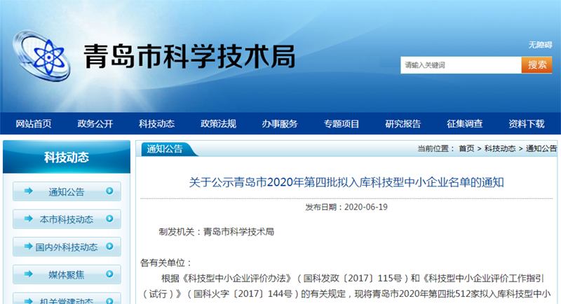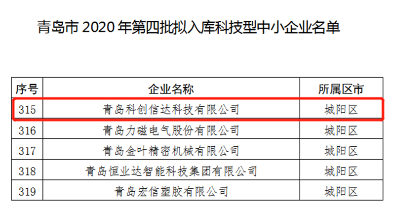 2020年6月19日,青島市科技局公布了2020年第四批進(jìn)入科技型中小企業(yè)的名單,青島科創(chuàng)信達(dá)科技有限公司通過此次認(rèn)定,成功入庫青島市第四批科技型中小企業(yè)。