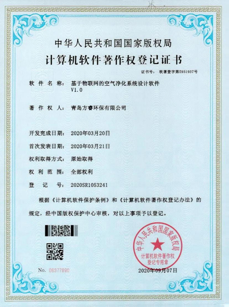 近日,青島方睿環(huán)保有限公司在綠天使指導(dǎo)咨詢下順利通過了軟件產(chǎn)品——“基于物聯(lián)網(wǎng)的空氣凈化系統(tǒng)設(shè)計(jì)軟件V1.0”,獲得國(guó)家版權(quán)局計(jì)算機(jī)軟件著作權(quán)登記證書。
